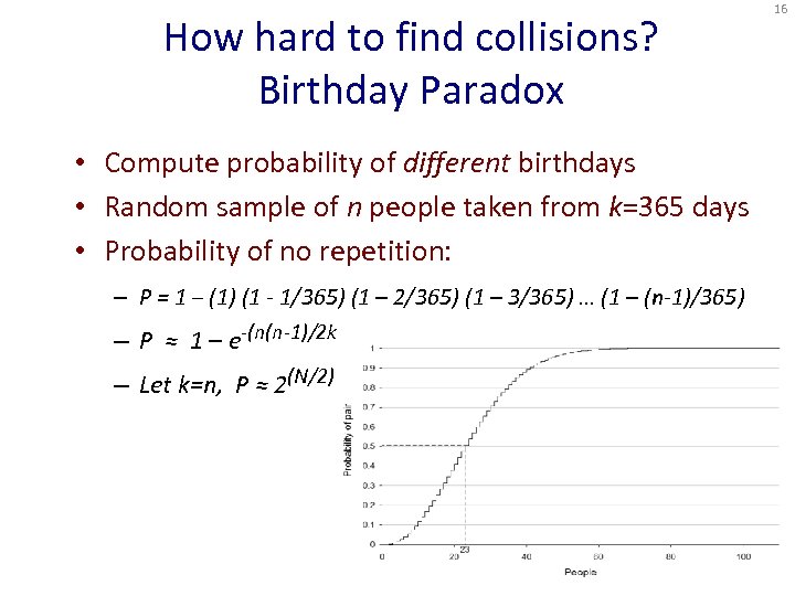 How hard to find collisions? Birthday Paradox • Compute probability of different birthdays • Random sample of n people taken from k=365 days • Probability of no repetition: – P = 1 – (1) (1 - 1/365) (1 – 2/365) (1 – 3/365) … (1 – (n-1)/365) – P ≈ 1 – e-(n(n-1)/2 k – Let k=n, P ≈ 2(N/2) 16