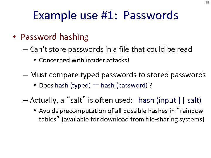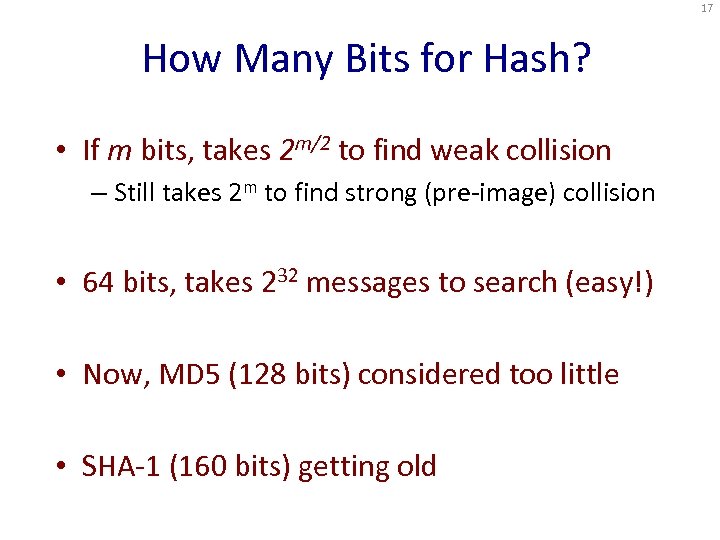 17 How Many Bits for Hash? • If m bits, takes 2 m/2 to find weak collision – Still takes 2 m to find strong (pre-image) collision • 64 bits, takes 232 messages to search (easy!) • Now, MD 5 (128 bits) considered too little • SHA-1 (160 bits) getting old