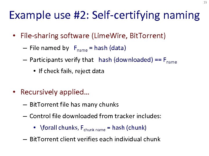 19 Example use #2: Self-certifying naming • File-sharing software (Lime. Wire, Bit. Torrent) – File named by Fname = hash (data) – Participants verify that hash (downloaded) == Fname • If check fails, reject data • Recursively applied… – Bit. Torrent file has many chunks – Control file downloaded from tracker includes: • forall chunks, Fchunk name = hash (chunk) – Bit. Torrent client verifies each individual chunk