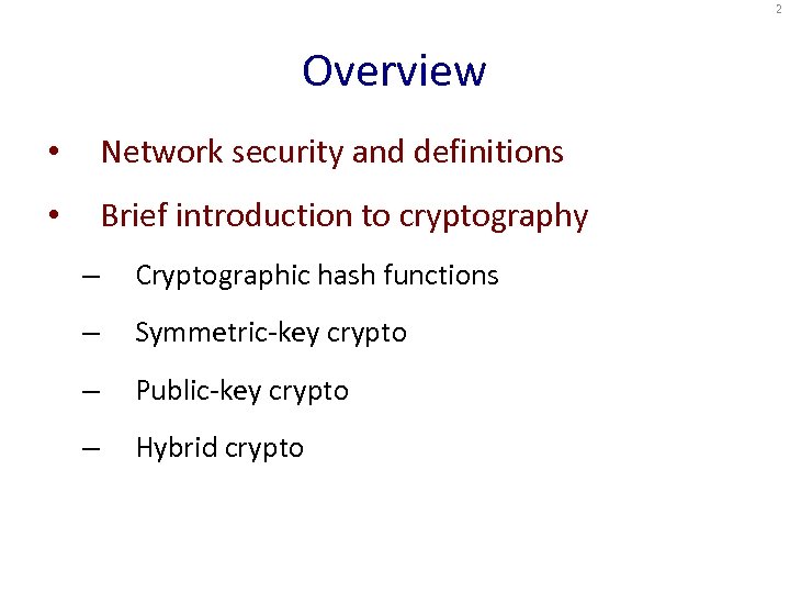 2 Overview • Network security and definitions • Brief introduction to cryptography – Cryptographic hash functions – Symmetric-key crypto – Public-key crypto – Hybrid crypto