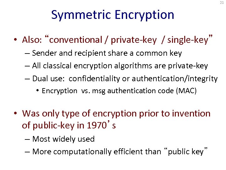 21 Symmetric Encryption • Also: “conventional / private-key / single-key” – Sender and recipient share a common key – All classical encryption algorithms are private-key – Dual use: confidentiality or authentication/integrity • Encryption vs. msg authentication code (MAC) • Was only type of encryption prior to invention of public-key in 1970’s – Most widely used – More computationally efficient than “public key”