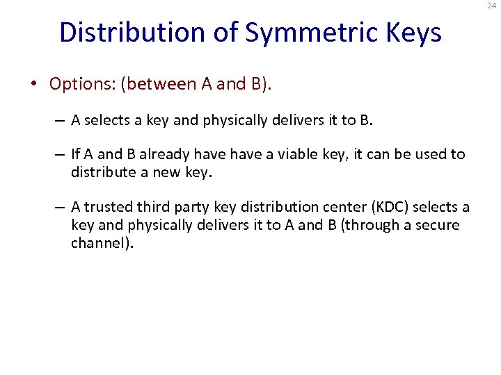 24 Distribution of Symmetric Keys • Options: (between A and B). – A selects a key and physically delivers it to B. – If A and B already have a viable key, it can be used to distribute a new key. – A trusted third party key distribution center (KDC) selects a key and physically delivers it to A and B (through a secure channel).