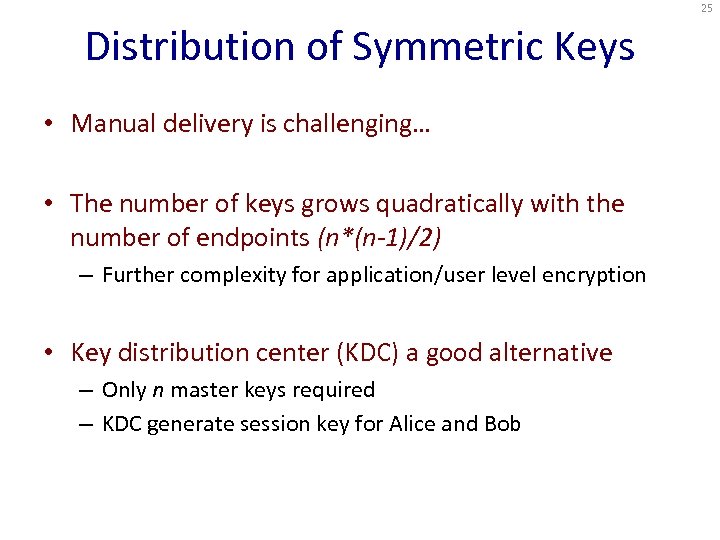 25 Distribution of Symmetric Keys • Manual delivery is challenging… • The number of keys grows quadratically with the number of endpoints (n*(n-1)/2) – Further complexity for application/user level encryption • Key distribution center (KDC) a good alternative – Only n master keys required – KDC generate session key for Alice and Bob