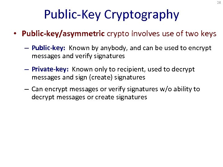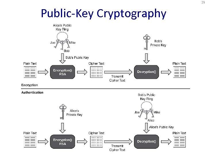 28 Public-Key Cryptography • Public-key/asymmetric crypto involves use of two keys – Public-key: Known by anybody, and can be used to encrypt messages and verify signatures – Private-key: Known only to recipient, used to decrypt messages and sign (create) signatures – Can encrypt messages or verify signatures w/o ability to decrypt messages or create signatures