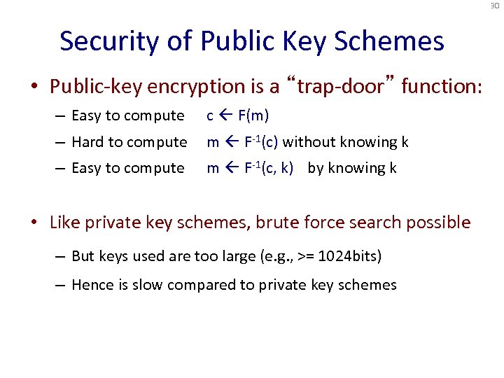 30 Security of Public Key Schemes • Public-key encryption is a “trap-door” function: – Easy to compute c F(m) – Hard to compute m F-1(c) without knowing k – Easy to compute m F-1(c, k) by knowing k • Like private key schemes, brute force search possible – But keys used are too large (e. g. , >= 1024 bits) – Hence is slow compared to private key schemes