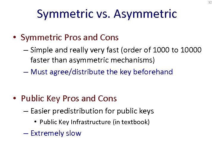 32 Symmetric vs. Asymmetric • Symmetric Pros and Cons – Simple and really very fast (order of 1000 to 10000 faster than asymmetric mechanisms) – Must agree/distribute the key beforehand • Public Key Pros and Cons – Easier predistribution for public keys • Public Key Infrastructure (in textbook) – Extremely slow