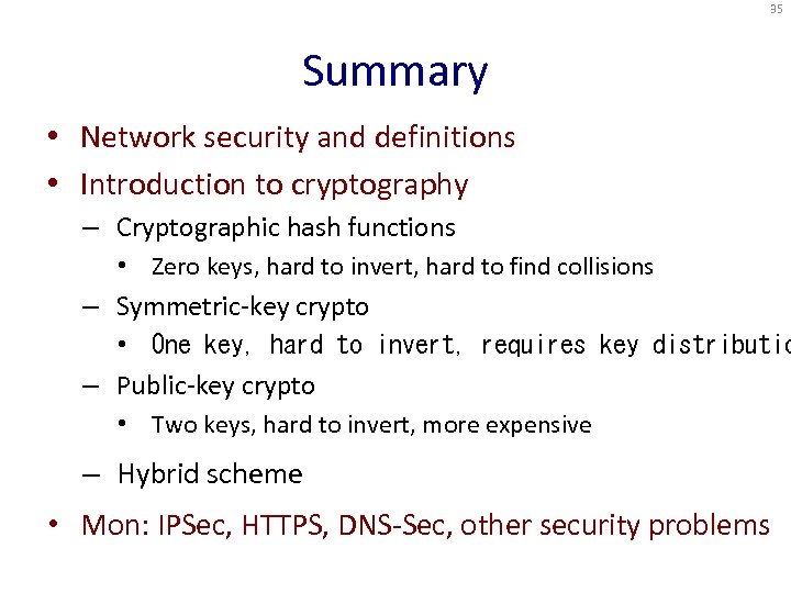 35 Summary • Network security and definitions • Introduction to cryptography – Cryptographic hash functions • Zero keys, hard to invert, hard to find collisions – Symmetric-key crypto • One key, hard to invert, requires key distributio – Public-key crypto • Two keys, hard to invert, more expensive – Hybrid scheme • Mon: IPSec, HTTPS, DNS-Sec, other security problems