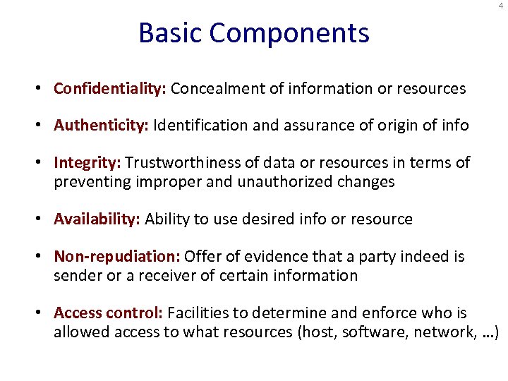 4 Basic Components • Confidentiality: Concealment of information or resources • Authenticity: Identification and assurance of origin of info • Integrity: Trustworthiness of data or resources in terms of preventing improper and unauthorized changes • Availability: Ability to use desired info or resource • Non-repudiation: Offer of evidence that a party indeed is sender or a receiver of certain information • Access control: Facilities to determine and enforce who is allowed access to what resources (host, software, network, …)