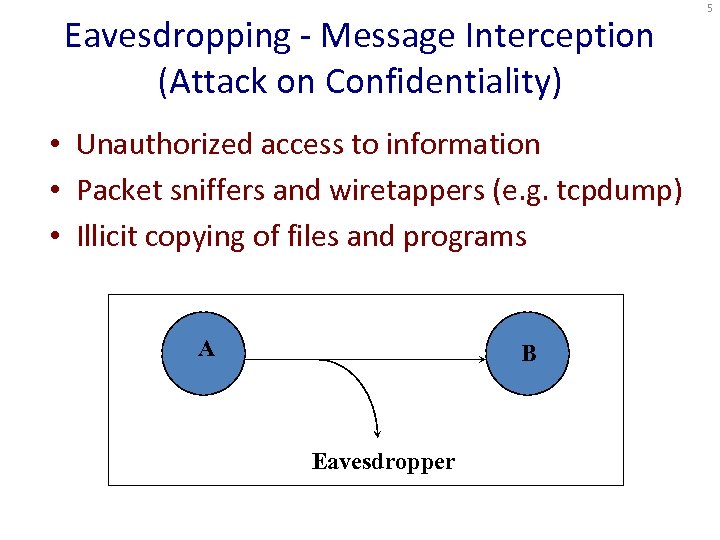 Eavesdropping - Message Interception (Attack on Confidentiality) • Unauthorized access to information • Packet sniffers and wiretappers (e. g. tcpdump) • Illicit copying of files and programs A B Eavesdropper 5