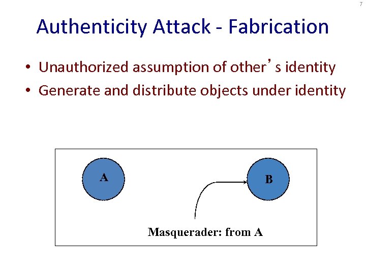 7 Authenticity Attack - Fabrication • Unauthorized assumption of other’s identity • Generate and distribute objects under identity A B Masquerader: from A