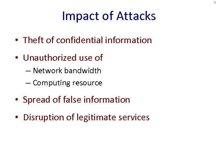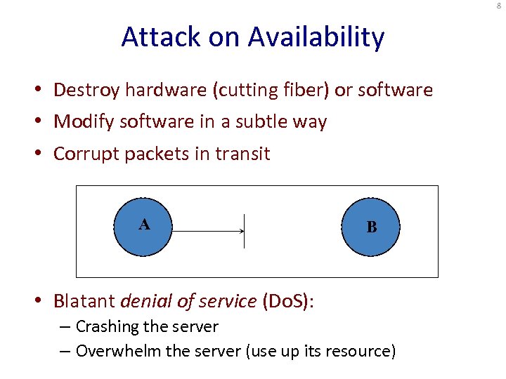 8 Attack on Availability • Destroy hardware (cutting fiber) or software • Modify software in a subtle way • Corrupt packets in transit A B • Blatant denial of service (Do. S): – Crashing the server – Overwhelm the server (use up its resource)
