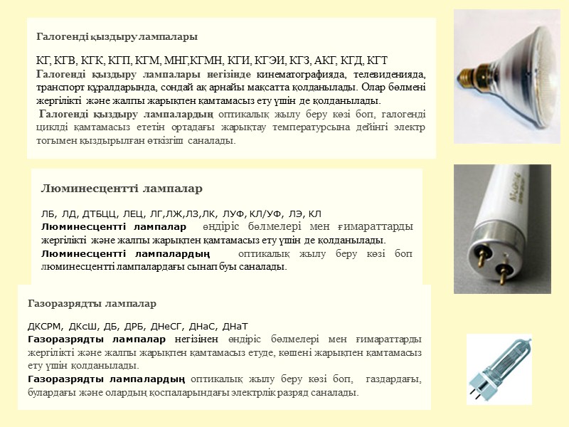 Люминесцентті лампалар ЛБ, ЛД, ДТБЦЦ, ЛЕЦ, ЛГ,ЛЖ,ЛЗ,ЛК, ЛУФ, КЛ/УФ, ЛЭ, КЛ Люминесцентті лампалар өндіріс бөлмелері мен ғимараттарды жергілікті және жалпы жарықпен қамтамасыз ету үшін де қолданылады. Люминесцентті лампалардың оптикалық жылу беру көзі боп люминесцентті лампалардағы сынап буы саналады. Галогенді қыздыру лампалары КГ, КГВ, КГК, КГП, КГМ, МНГ,КГМН, КГИ, КГЭИ, КГЗ, АКГ, КГД, КГТ Галогенді қыздыру лампалары негізінде кинематографияда, телевиденияда, транспорт құралдарында, сондай ақ арнайы мақсатта қолданылады. Олар бөлмені жергілікті және жалпы жарықпен қамтамасыз ету үшін де қолданылады. Галогенді қыздыру лампалардың оптикалық жылу беру көзі боп, галогенді циклді қамтамасыз ететін ортадағы жарықтау температурсына дейінгі электр тогымен қыздырылған өткізгіш саналады. Газоразрядты лампалар ДКСРМ, ДКсШ, ДБ, ДРБ, ДНеСГ, ДНаС, ДНаТ Газоразрядты лампалар негізінен өндіріс бөлмелері мен ғимараттарды жергілікті және жалпы жарықпен қамтамасыз етуде, көшені жарықпен қамтамасыз ету үшін қолданылады. Газоразрядты лампалардың оптикалық жылу беру көзі боп, газдардағы, булардағы және олардың қоспаларындағы электрлік разряд саналады.