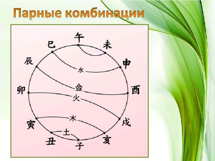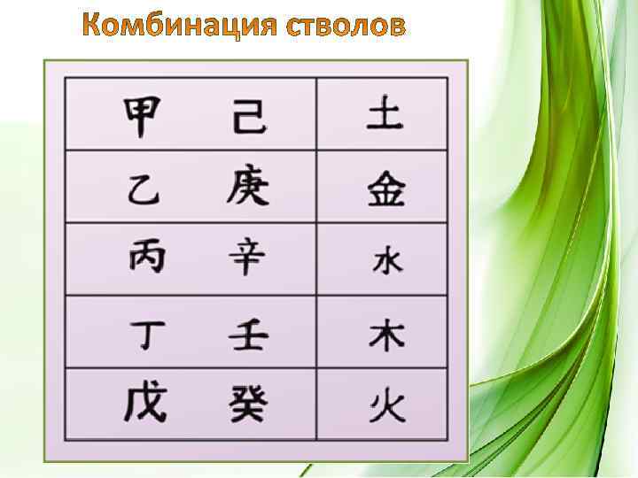 1 Дерево ЯН Цзя 2 Дерево ИНЬ И 3 Огонь ЯН Бин 4 Огонь ИНЬ Дин 5 Земля ЯН У 6 Земля ИНЬ Цзи 7 Металл ЯН Гэн 8 Металл ИНЬ Синь 9 Вода ЯН Жень 10 Вода ИНЬ Гуй