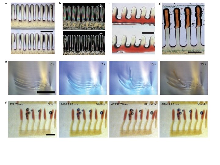 Responses of 7 mm long, 4 mm wide and 10 μm thick actuator with varying molecular alignment configurations on 100 m. W/cm 2 UV illumination from the top. Splayed films bend up or down depending on the molecular orientation. Images were taken after 0, 0. 04, 0. 20 or 0. 50 seconds of exposure and after 40 seconds of recovery in dark conditions. Eur. Phys. J. E 2007, 23, 329