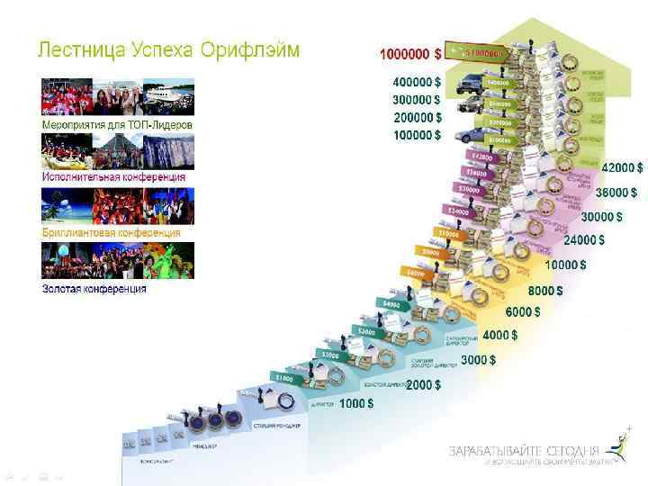 Рост доходов лидеров Звание Раньше годовой доход, руб. НОВЫЙ годовой доход, руб. Старший Менеджер 250 000 330 000 Директор 300 000 400 000 Старший Директор 600 000 Золотой Директор 600 000 900 000 Старший Золотой Директор 900 000 1 200 000 Сапфировый Директор 1 200 000 1 650 000 Бриллиантовый Директор 1 800 000 2 550 000 Старший Бриллиантовый Директор 2 400 000 3 150 000 Дважды Бриллиантовый Директор 3 000 4 500 000 Исполнительный Директор 4 500 000 6 000 Золотой Исполнительный Директор 4 500 000 7 500 000 Сапфировый Исполнительный Директор 4 500 000 9 000 Бриллиантовый Исполнительный Директор 4 500 000 10 500 000 Президент 9 000 12 000 Старший Президент 9 000 14 250 000 Золотой Президент 9 000 18 000 Сапфировый Президент 9 000 22 500 000 Бриллиантовый Президент 9 000 30 000