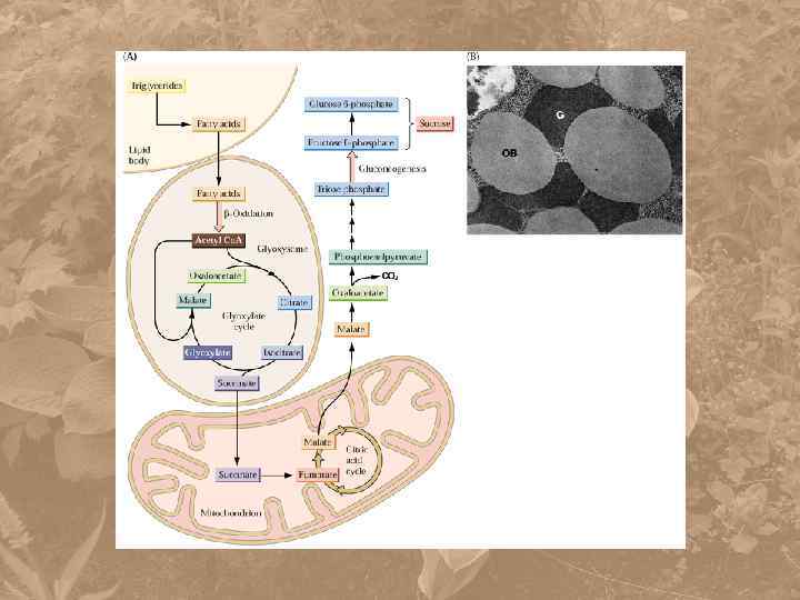 олеосома жиры глицерин липаза жирные кислоты Ацил-Со. А глиоксисома n. O 2 -окисление Ацетил-Со. А Глиоксилатный цикл n. НАД + n. НАДH n. H 2 O 2 Глиоксилатный цикл сукцинат митохондрия глюкоза ЦТК малат глюконеогенез ФЕП-карбоксикиназа АТФ СО 2 малатдегидрогеназа оксалоацетат фосфоенолпируват АД Ф малат НАД+ НАДН