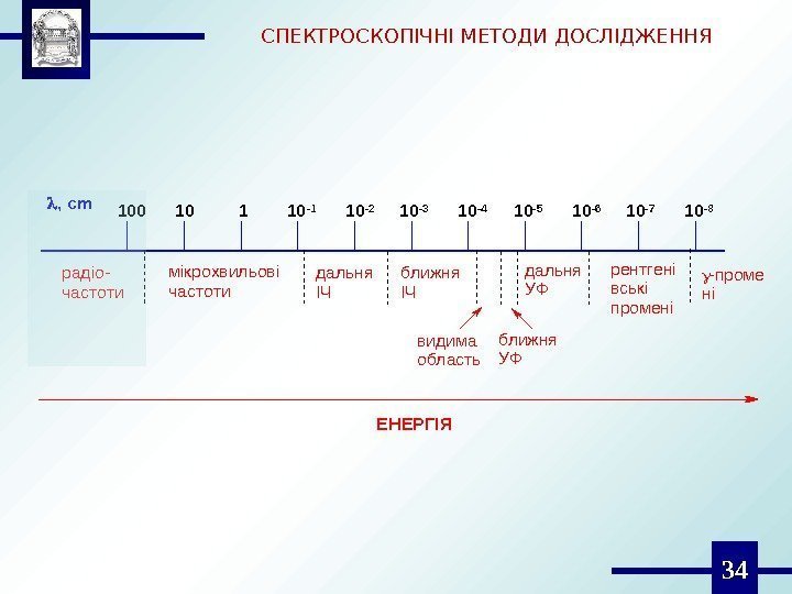 32, cm 100 10 1 10 -110 -210 -310 -4 10 -510 -610 -710 -8 радіо- частоти мікрохвильові частоти дальня ІЧ ближня ІЧ видима область ближня УФ дальня УФ рентгені вські промені -проме ні ЕНЕРГІЯСПЕКТРОСКОПІЧНІ МЕТОДИ ДОСЛІДЖЕННЯ