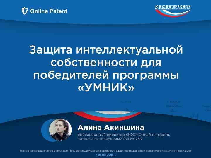 Спасибо за внимание! Защита интеллектуальной собственности для победителей программы УМНИК Алина Акиншина Патентный поверенный РФ № 1733 +7 929 669 14 10 akinshinaav@onlinepatent. ru