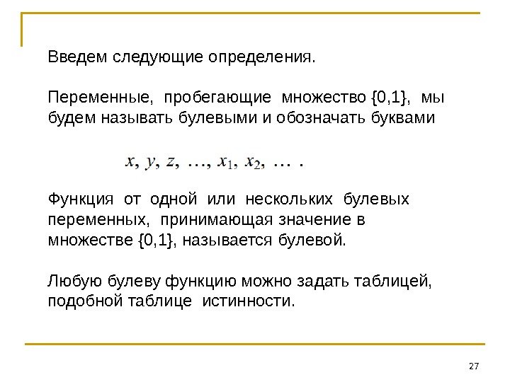27 Введем следующие определения. Переменные, пробегающие множество {0, 1}, мы будем называть булевыми и обозначать буквами Функция от одной или нескольких булевых переменных, принимающая значение в множестве {0, 1}, называется булевой. Любую булеву функцию можно задать таблицей, подобной таблице истинности.
