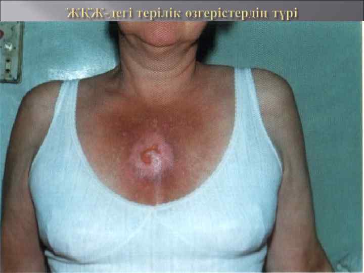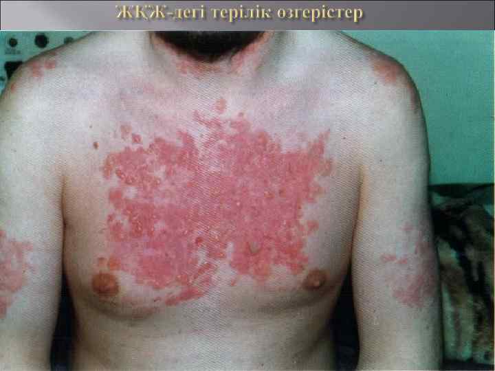 Еріндегі хейлиттің сипатты, терең эрозиялы-жаралы, Ирганг. Капоши түрі. Кілегей қабатындағы сипатты эксудациялыгиперемиялы, эрозиялы-жаралы түрі.