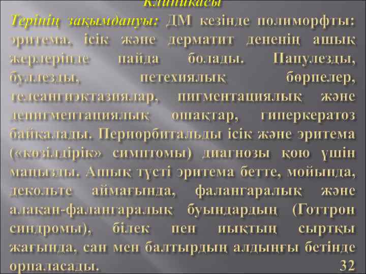 Зақымданулардың клиникалықморфологиялық сипаттамалары: терінің: "көбелек" белгісі, капилляриттер, экссудатты эритема, пурпура, дискоидтық жегі т. б. ; буындардың: артралгиялар және полиартриттің жедел, жеделдеу, созылмалы түрлері; сероздық қабықтардың: полисерозит, плеврит, перикардит (құрғақ және жабысқақты), периспленит; жүректің: миокардит, эндокардит, митральді қақпақтың жетіспеушілігі;