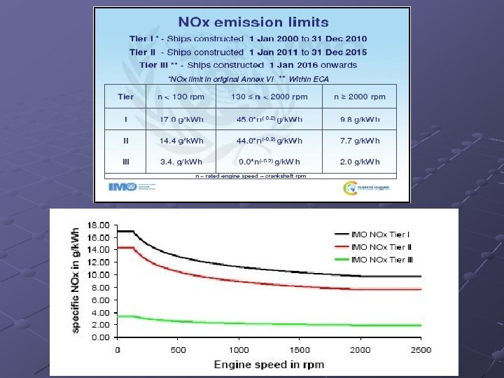 2. 6. Анекс VІ – Правила за предотвратяване на замърсяването на въздуха от корабите 2. 6. 1. Озоно-разрушаващи вещества (съгласно Правило 12) 2. 6. 2. Азотни окиси (NOx) (съгласно Правило 13) – нормите към двигателите поетапно се занижават. Първи ред (Tier I) – за корабни дизелови двигатели монтирани на кораби на или след 01. 2000 г. до 01. 2011 г. са лимитирани: 1) 17. 0 g/k. Wh , когато честотата на въртене n е под 130 об/мин. 2) 45. n(-0. 2) g/k. Wh, когато честотата на въртене n е 130 об/мин. и повече, но помалко от 2000 об/мин. 3) 9, 8 g/k. Wh, когато честотата на въртене n е 2000 об/мин. и повече. Втори ред (Tier II) – за корабни дизелови двигатели монтирани на кораби на или след 01. 2011 г. : 1) 14, 4 g/k. Wh, когато честотата на въртене n е под 130 об/мин. 2) 44. n(-0. 23) g/k. Wh, когато честотата на въртене n е 130 об/мин. и повече, но помалко от 2000 об/мин. 3) 7, 7 g/k. Wh, когато честотата на въртене n е 2000 об/мин. и повече. Трети ред (Tier III) – за корабни дизелови двигатели монтирани на кораби на или след 01. 2016 г. : 1) 3, 4 g/k. Wh, когато честотата на въртене n е под 130 об/мин. 2) 9. n(-0. 23) g/k. Wh, когато честотата на въртене n е 130 об/мин. и повече, но помалко от 2000 об/мин. 3) 2 g/k. Wh, когато честотата на въртене n е 2000 об/мин. и повече. Изискванията на трети ред са само за зоните за контрол. Зоните за контрол са: - Северно Американско море - всеки други морски район или район на пристанище, който е признат от Организацията.
