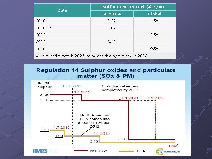 2. 6. 3. Серни окиси (SOx) и особени вещества (съгласно Правило 14) Съдържанието на сяра във всяко гориво използвано на борда на корабите не трябва да превишава: 1) 4, 50% m/m до 01. 2012 г. 2 )3, 50% m/m на и след 01. 2012 г. 3) 0, 50% m/m на и след 01. 2020 г. Контролът на съдържанието на сяра в приеманото гориво да се извършва съгласно процедурата препоръчана от Организацията. Изисквания към зоните за контрол Зоните за контрол за това правило са: - районът на Балтийско море и Северно море; - районът на Северна Америка; - всеки други морски район или район на пристанище, който е признат от Организацията. На всеки кораб, който плава в зоните за контрол, съдържанието на сяра в горивото не трябва да превишава: 1) 1, 50% m/m до 01. 07. 2010 г. 2) 1, 00% m/m на и след 01. 07. 2010 г. 3) 0, 10% m/m на и след 01. 2015 г.
