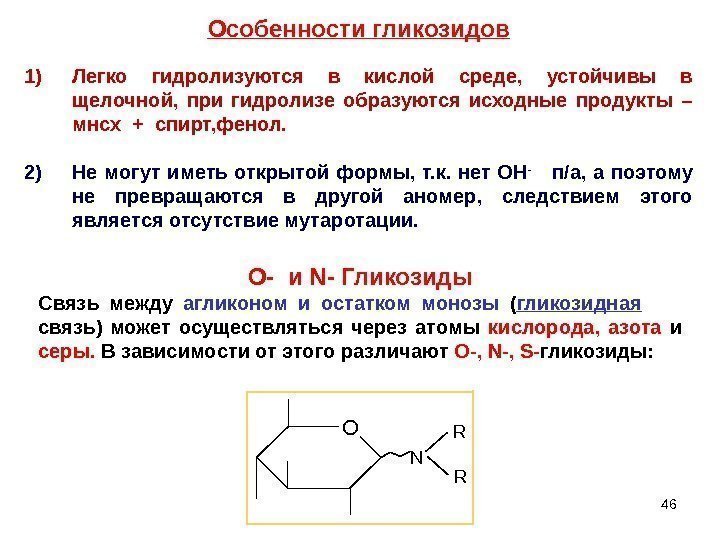 46 Особенности гликозидов 1) Легко гидролизуются в кислой среде, устойчивы в щелочной, при гидролизе образуются исходные продукты – мнсх + спирт, фенол. 2) Не могут иметь открытой формы, т. к. нет ОН — п/а, а поэтому не превращаются в другой аномер, следствием этого является отсутствие мутаротации. O — и N- Гликозиды Связь между агликоном и остатком монозы ( гликозидная связь) может осуществляться через атомы кислорода, азота и серы. В зависимости от этого различают O-, N-, S- гликозиды: O N R R