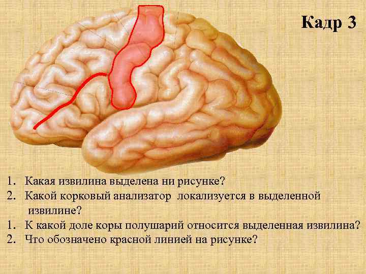 Кадр 3 1. Какая извилина выделена ни рисунке? 2. Какой корковый анализатор локализуется в выделенной извилине? 1. К какой доле коры полушарий относится выделенная извилина? 2. Что обозначено красной линией на рисунке?