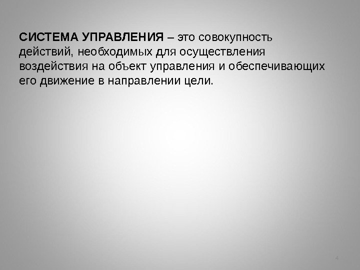4 СИСТЕМА УПРАВЛЕНИЯ – это совокупность действий, необходимых для осуществления воздействия на объект управления и обеспечивающих его движение в направлении цели.