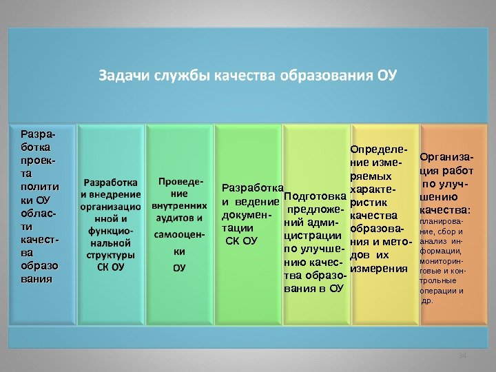 34 Разра- ботка проек- та та полити ки ОУ облас- ти ти качест- ва ва образо вания Разработка и ведение докумен- тации СК ОУ Подготовка предложе- ний адми- цистрации по улучше- нию качес- тва образо- вания в ОУ Определе- ние изме- ряемых характе- ристик качества образова- ния и мето- дов их измерения Организа- ция работ по улуч- шению качества: планирова- ние, сбор и анализ ин- формации, мониторин- говые и кон- трольные операции и др.