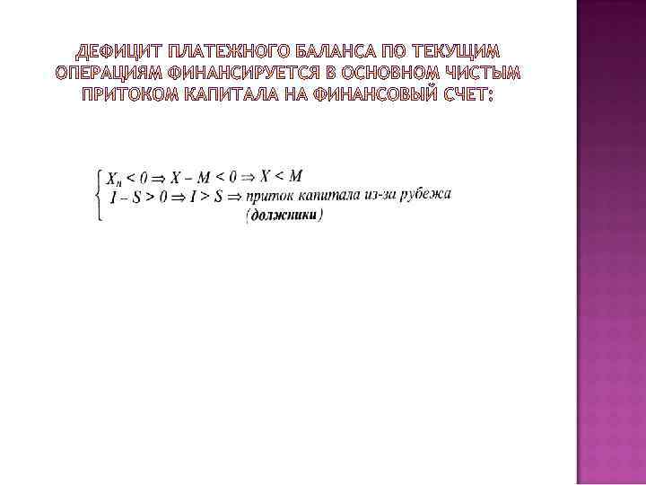 расходы по оплате импорта превосходят доходы, полученные от экспорта 1. 2. Дефицит финансируется: Засчет зарубежных займов. Путем продажи части активов иностранцам (ведет к сокращению чистых зарубежных активов).