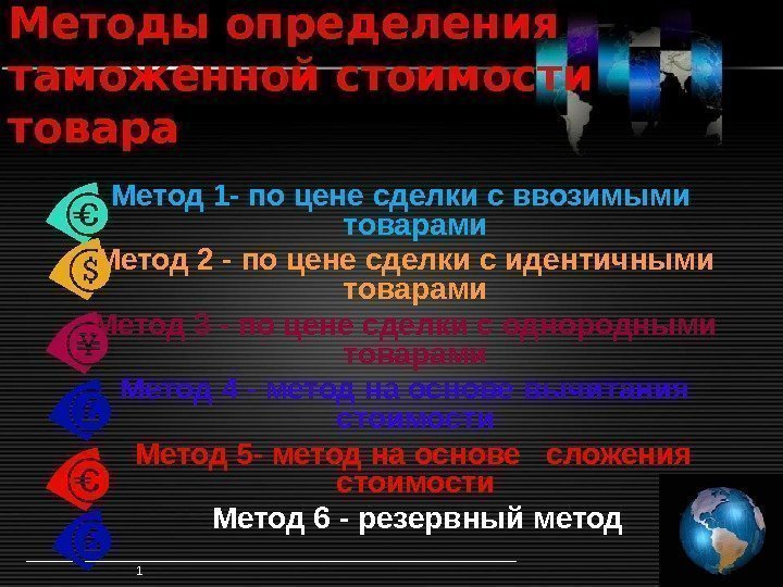 1 Методы определения таможенной стоимости товара Метод 1 — по цене сделки с ввозимыми товарами Метод 2 — по цене сделки с идентичными товарами Метод 3 — по цене сделки с однородными товарами Метод 4 — метод на основе вычитания стоимости Метод 5 — метод на основе сложения стоимости Метод 6 — резервный метод