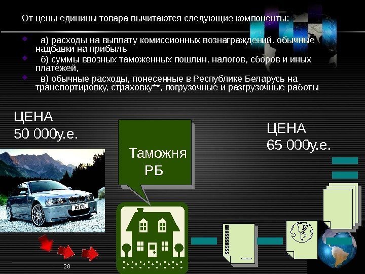 28 Метод 4 (2) От цены единицы товара вычитаются следующие компоненты: а) расходы на выплату комиссионных вознаграждений, обычные надбавки на прибыль б) суммы ввозных таможенных пошлин, налогов, сборов и иных платежей, в) обычные расходы, понесенные в Республике Беларусь на транспортировку, страховку**, погрузочные и разгрузочные работы ЦЕНА 50 000 у. е. ЦЕНА 65 000 у. е. Таможня РБ
