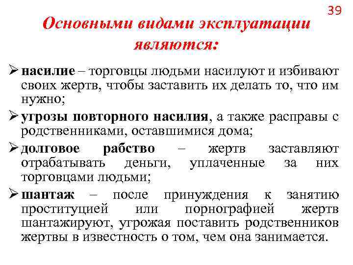 Основными видами эксплуатации являются: 39 Ø насилие – торговцы людьми насилуют и избивают своих жертв, чтобы заставить их делать то, что им нужно; Ø угрозы повторного насилия, а также расправы с родственниками, оставшимися дома; Ø долговое рабство – жертв заставляют отрабатывать деньги, уплаченные за них торговцами людьми; Ø шантаж – после принуждения к занятию проституцией или порнографией жертв шантажируют, угрожая поставить родственников жертвы в известность о том, чем она занимается.