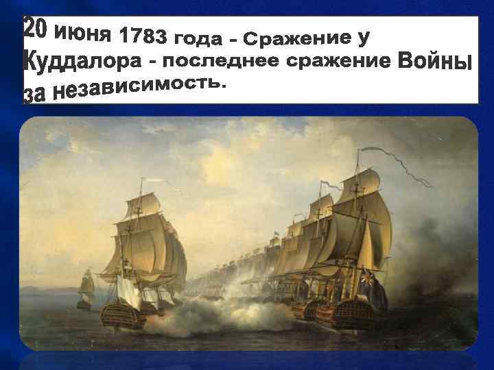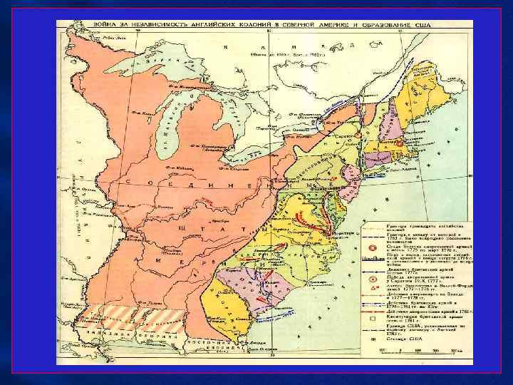 Итоги войны Силы сторон 27 000 солдат континентальной армии США 250 000 ополченцев 5 000 негров 13 500 французов 8 000 испанцев 30 -40 фрегатов и мелких кораблей 15 200 британцев 50 000 лоялистов 20 000 негров 30 000 немцев (Гессенские солдаты) 13 000 индейцев 100 фрегатов и линейных кораблей Военные потери 8 000 убиты 17 000 умерли от болезней 25 000 ранены 8 000 убиты 17 000 умерли от болезней 24 000 ранены