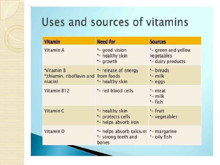 Vitamins are needed in very small amounts for growth, regulating body functions, and preventing disease. A well-balanced diet usually gives your body all the vitamins it needs. The main vitamins are vitamin A, the B complex of vitamins, vitamin C and vitamin D Because most vitamins cannot be made in the body, we must obtain them through the diet. Many people say that they feel more energetic after consuming vitamins, but vitamins are not a source of energy (calories). Vitamins are best consumed through a varied diet rather than as a supplement because there is little chance of taking too high a dose.