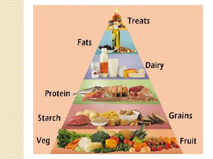 Because no food has every nutrient, people should eat a variety of foods. The food pyramid helps people select foods that supply all the nutrients they need. Foods that contain the same nutrients belong to a food group. There are five food groups: - Bread and cereal - Vegetable - Fruit - Milk - Meat