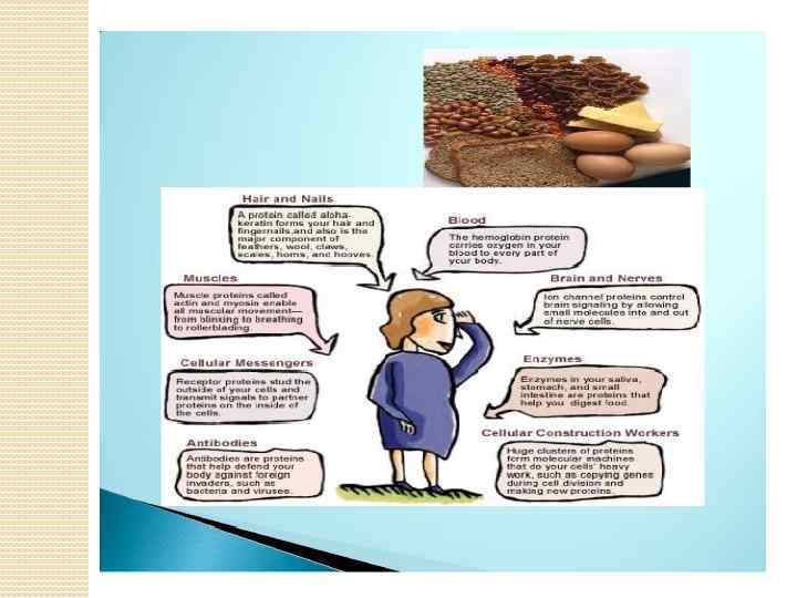 Proteins a. Used for replacement and repair of body cells and for growth b. Made up of amino acids (essential amino acids must be supplied by food) c. Found in eggs, milk, cheese, fish and meat d. 1 gram of protein equals 4 calories