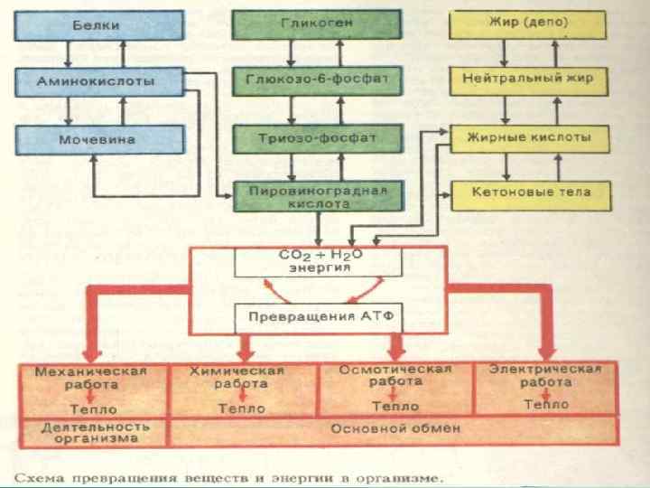 Обмен веществ начинается с поступления питательных веществ в желудочно-кишечный тракт и воздуха в легкие. Первым этапом обмена веществ являются ферментативные процессы расщепления белков, жиров и углеводов до растворимых в воде аминокислот, моно- и дисахаридов, глицерина, жирных кислот и других соединений, происходящие в различных отделах желудочно-кишечного тракта, а также всасывание этих веществ в кровь и лимфу. Вторым этапом обмена являются транспорт питательных веществ и кислорода кровью к тканям и те сложные химические превращения веществ, которые происходят в клетках. В них одновременно осуществляются расщепление питательных веществ до конечных продуктов метаболизма, синтез ферментов, гормонов, составных частей цитоплазмы. Расщепление веществ сопровождается выделением энергии, которая используется для процессов синтеза и обеспечения работы каждого органа и организма в целом. Третьим этапом является удаление конечных продуктов распада из клеток, их транспорт и выделение почками, легкими, потовыми железами и кишечником. Превращение белков, жиров, углеводов, минеральных веществ и воды происходит в тесном взаимодействии друг с другом. В метаболизме каждого из них имеются свои особенности, а физиологическое значение их различно, поэтому обмен каждого из этих веществ принято рассматривать отдельно.