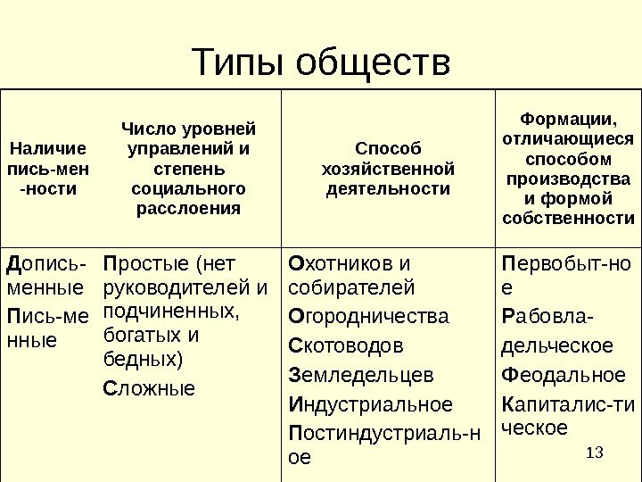 13 Типы обществ Наличие пись-мен -ности Число уровней управлений и степень социального расслоения Способ хозяйственной деятельности Формации, отличающиеся способом производства и формой собственности Д опись- менные П ись-ме нные П ростые (нет руководителей и подчиненных, богатых и бедных) С ложные О хотников и собирателей О городничества С котоводов З емледельцев И ндустриальное П остиндустриаль-н ое П ервобыт-но е Р абовла- дельческое Ф еодальное К апиталис-ти ческое