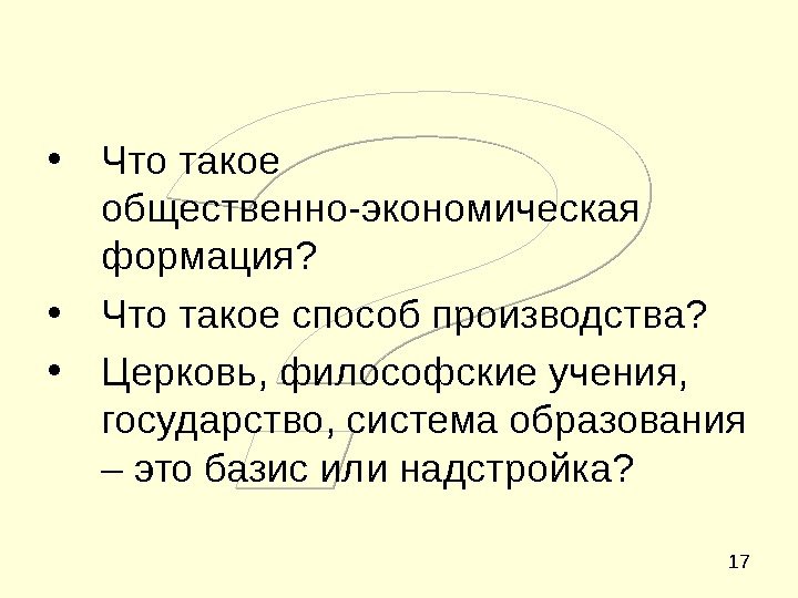 17 • Что такое общественно-экономическая формация? • Что такое способ производства? • Церковь, философские учения, государство, система образования – это базис или надстройка?
