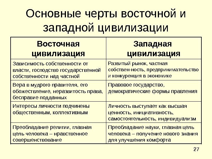 27 Основные черты восточной и западной цивилизации Преобладание науки, главная цель человека – получение нового знания для улучшения комфорта. Преобладание религии, главная цель человека – нравственное совершенствование Личность выступает как высшая ценность, инициативность, самостоятельность, индивидуализм. Интересы личности подчинены общественным, коллективным Правовое государство, демократические формы правления. Вера в мудрого правителя, его обожествление, неразвитость права, бесправие подданных Развитый рынок, частная собствен-ность, предпринимательство и конкуренция в экономике. Зависимость собственности от власти, господство государственной собственности над частной Западная цивилизация. Восточная цивилизация