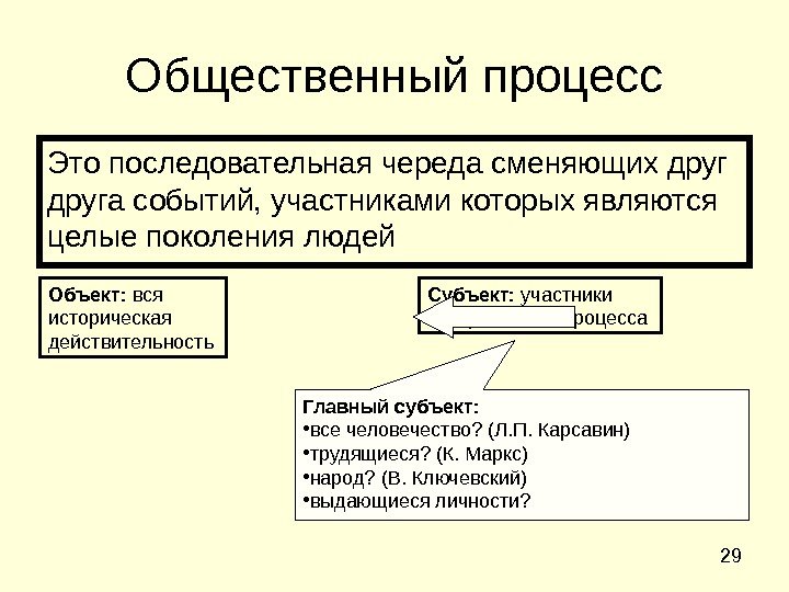 29 Общественный процесс Это последовательная череда сменяющих друга событий, участниками которых являются целые поколения людей Субъект: участники исторического процесса. Объект: вся историческая действительность Главный субъект: • все человечество? (Л. П. Карсавин) • трудящиеся? (К. Маркс) • народ? (В. Ключевский) • выдающиеся личности?