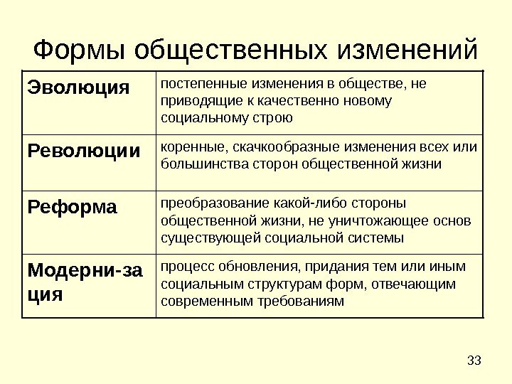 33 Формы общественных изменений процесс обновления, придания тем или иным социальным структурам форм, отвечающим современным требованиям. Модерни-за ция преобразование какой-либо стороны общественной жизни, не уничтожающее основ существующей социальной системы. Реформа коренные, скачкообразные изменения всех или большинства сторон общественной жизни. Революции постепенные изменения в обществе, не приводящие к качественно новому социальному строю. Эволюция