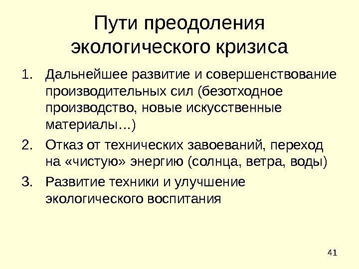 41 Пути преодоления экологического кризиса 1. Дальнейшее развитие и совершенствование производительных сил (безотходное производство, новые искусственные материалы…) 2. Отказ от технических завоеваний, переход на «чистую» энергию (солнца, ветра, воды) 3. Развитие техники и улучшение экологического воспитания