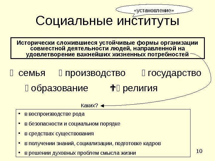 10 Социальные институты Исторически сложившиеся устойчивые формы организации совместной деятельности людей, направленной на удовлетворение важнейших жизненных потребностей «установление» семья производство государство образование религия • в воспроизводстве рода • в безопасности и социальном порядке • в средствах существования • в получении знаний, социализации, подготовке кадров • в решении духовных проблем смысла жизни Каких?
