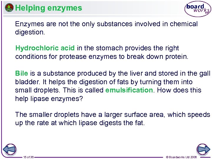 Helping enzymes Enzymes are not the only substances involved in chemical digestion. Hydrochloric acid in the stomach provides the right conditions for protease enzymes to break down protein. Bile is a substance produced by the liver and stored in the gall bladder. It helps the digestion of fats by turning them into small droplets. This is called emulsification. How does this help lipase enzymes? The smaller droplets have a larger surface area, which speeds up the rate at which lipase digests the fat. 15 of 36 © Boardworks Ltd 2006