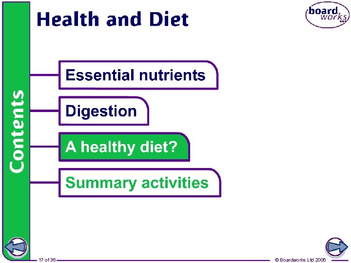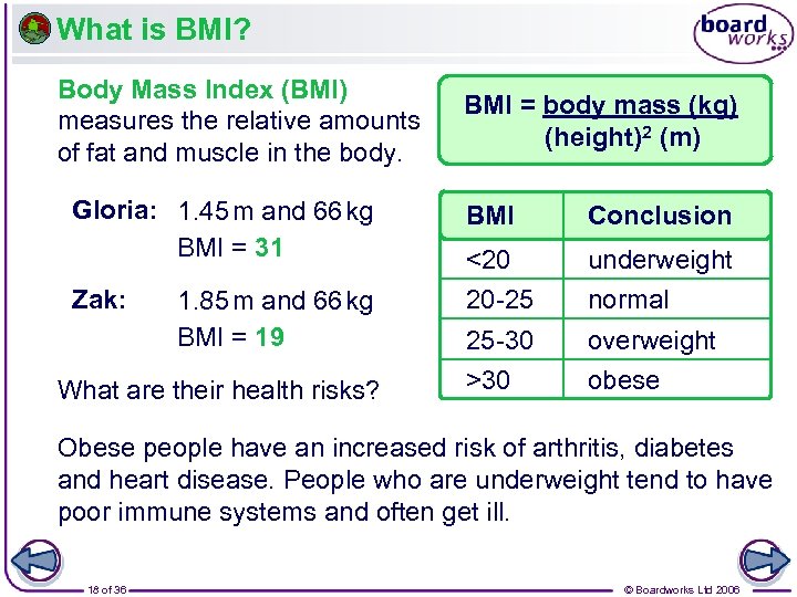 What is BMI? Body Mass Index (BMI) measures the relative amounts of fat and muscle in the body. BMI = body mass (kg) (height)2 (m) Gloria: 1. 45 m and 66 kg BMI = 31 BMI Conclusion <20 underweight Zak: 20 -25 normal 25 -30 overweight >30 obese 1. 85 m and 66 kg BMI = 19 What are their health risks? Obese people have an increased risk of arthritis, diabetes and heart disease. People who are underweight tend to have poor immune systems and often get ill. 18 of 36 © Boardworks Ltd 2006