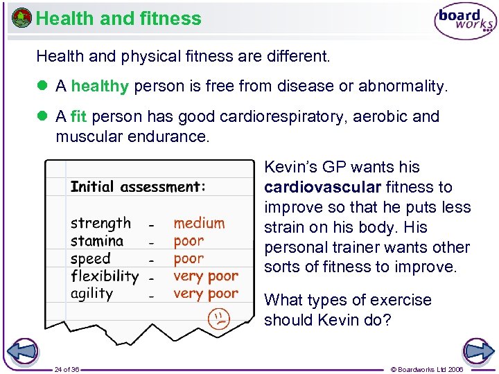 Health and fitness Health and physical fitness are different. l A healthy person is free from disease or abnormality. l A fit person has good cardiorespiratory, aerobic and muscular endurance. Kevin’s GP wants his cardiovascular fitness to improve so that he puts less strain on his body. His personal trainer wants other sorts of fitness to improve. What types of exercise should Kevin do? 24 of 36 © Boardworks Ltd 2006